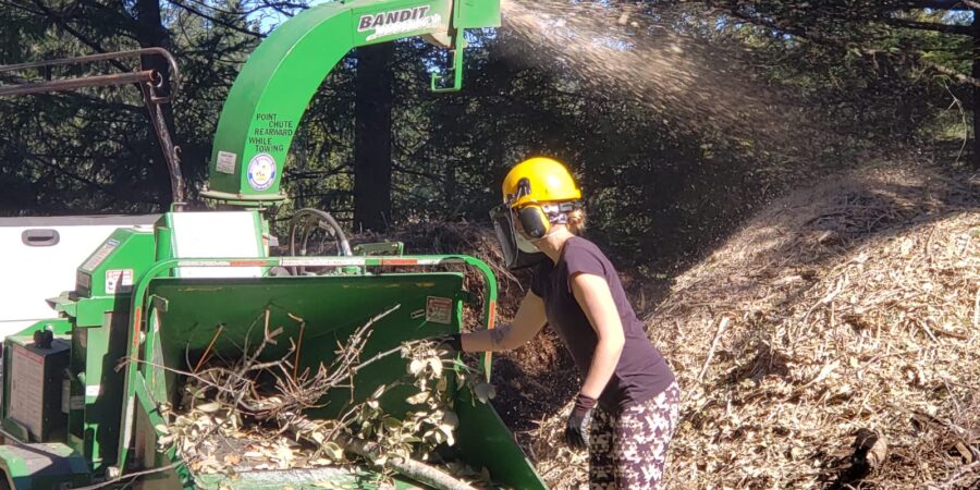 A chipper was hired for a few days to process the brush piles during warm, sunny days in late February